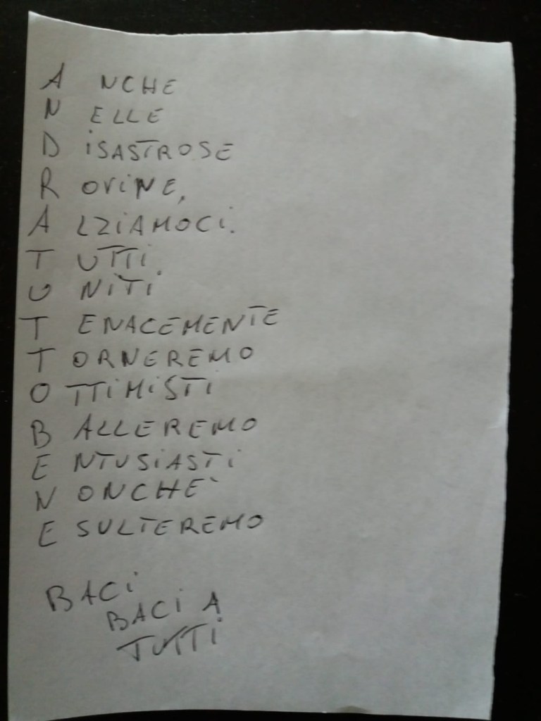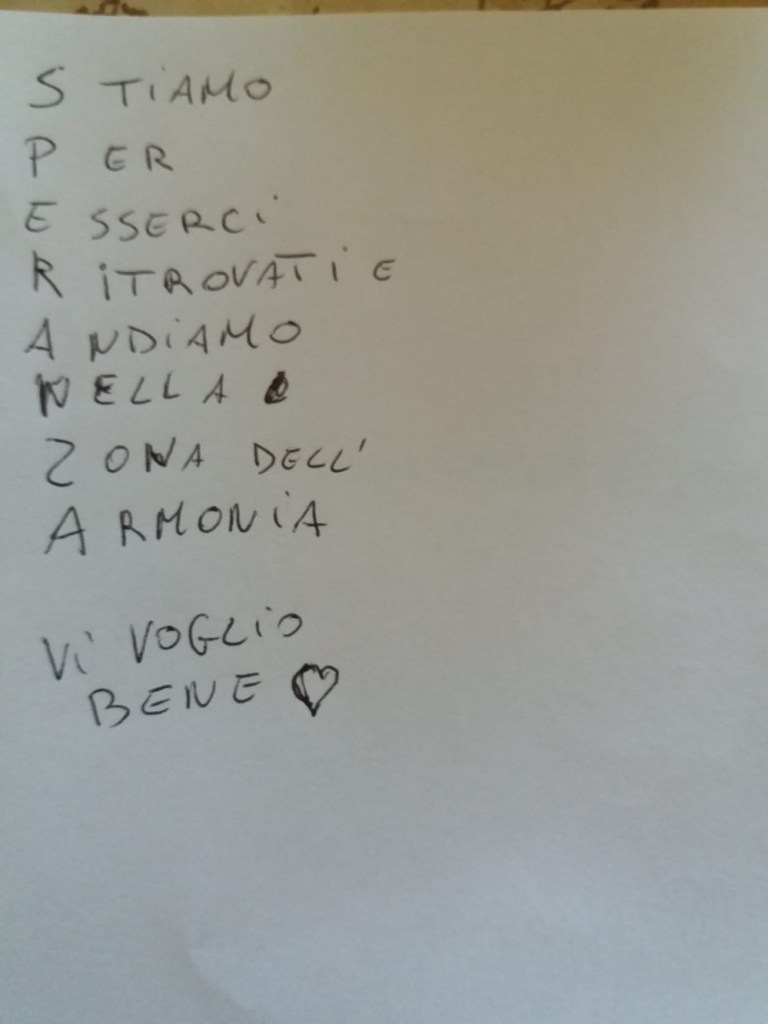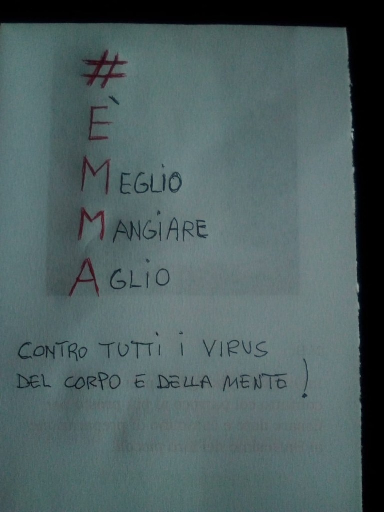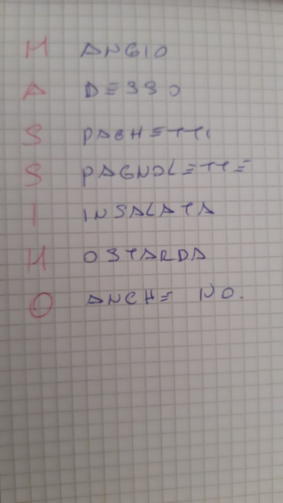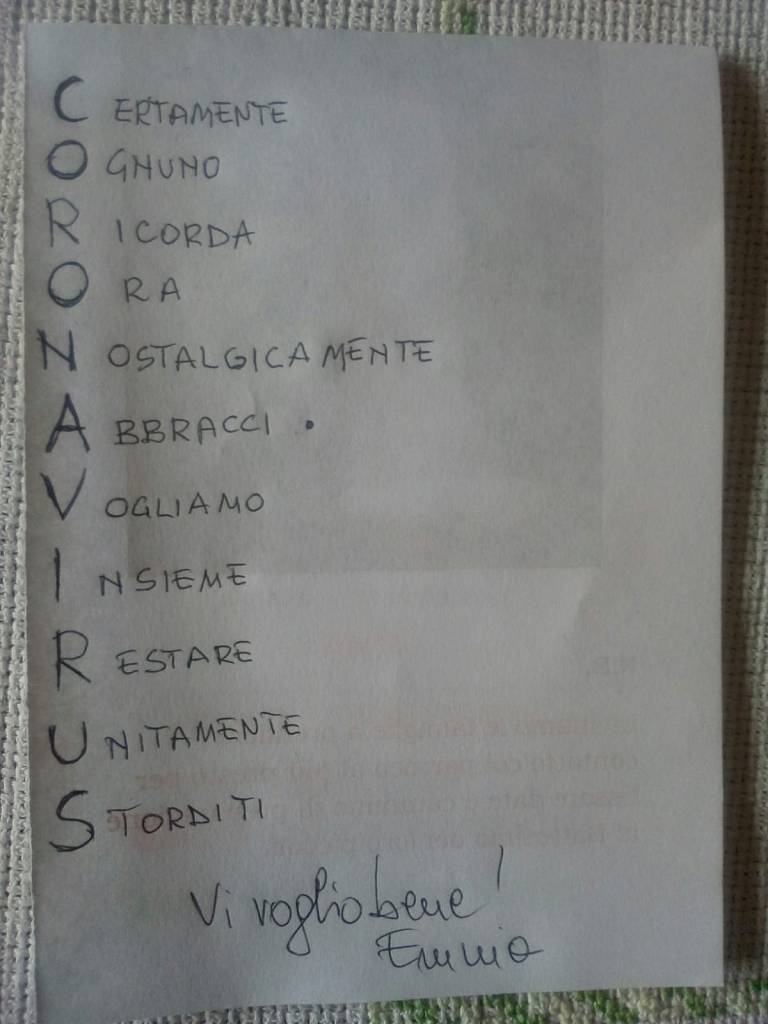 Noi siamo un’associazione che non demorde mai, e messa a dura prova, si è costruita da sola una zattera di salvataggio. Il nostro WhatsApp. Così ogni giorno a turno, un volontario metteva una parola e chi gareggiava faceva il suo acronimo. Ma WhatSapp non è servito solo per giocare ma anche per ridere con barzellette spiritose, con indovinelli spiritosi e con grammi da azzeccare nei piatti prelibati del nostro chef.