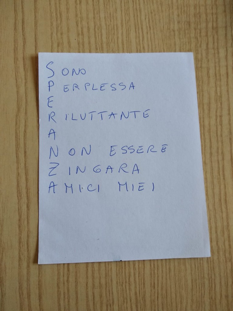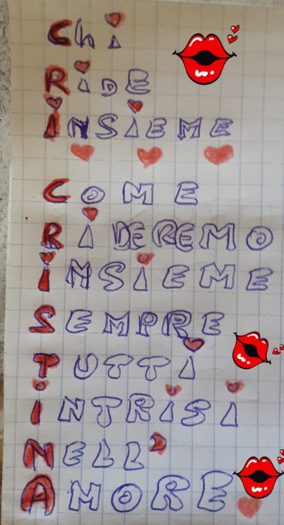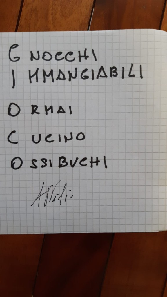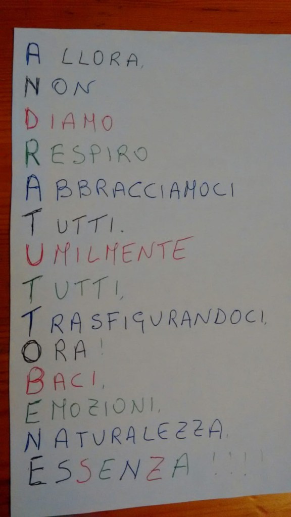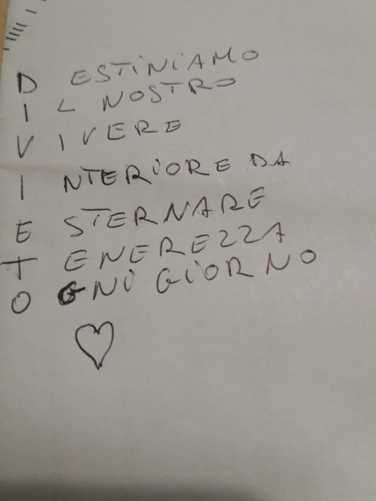 Noi siamo un’associazione che non demorde mai, e messa a dura prova, si è costruita da sola una zattera di salvataggio. Il nostro WhatsApp. Così ogni giorno a turno, un volontario metteva una parola e chi gareggiava faceva il suo acronimo. Ma WhatSapp non è servito solo per giocare ma anche per ridere con barzellette spiritose, con indovinelli spiritosi e con grammi da azzeccare nei piatti prelibati del nostro chef.
